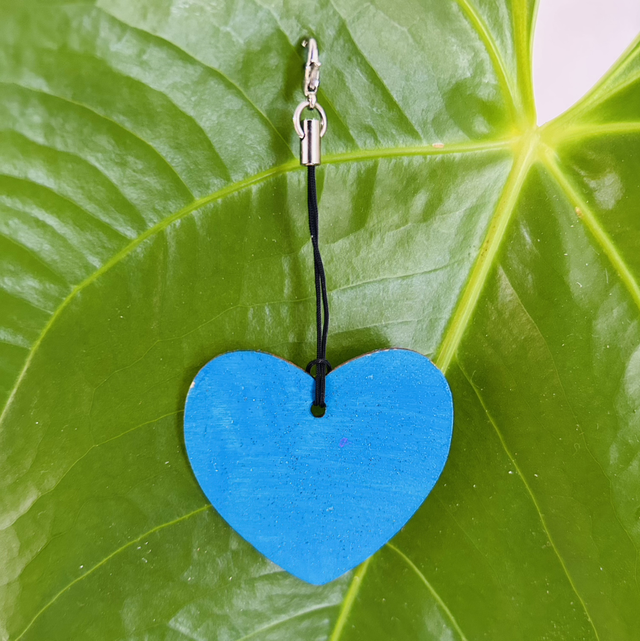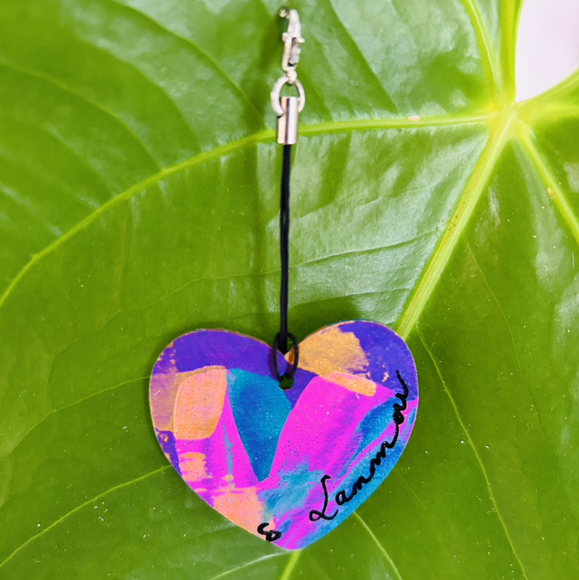 Porte clé cœur en bois avec un style de peinture abstrait. Dimensions :5x4,8cm, finition au vernis.